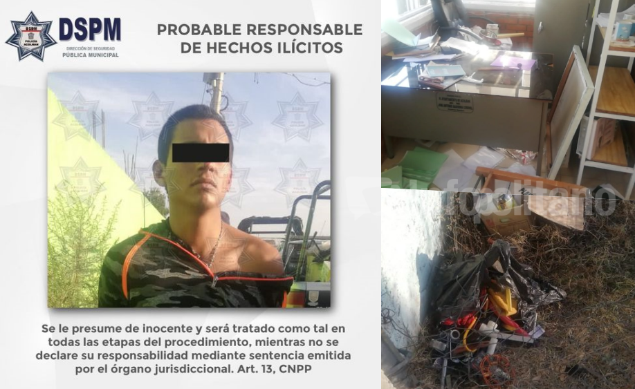 Al arribar al lugar, detuvieron a Gerardo Arturo “N” de 22 años de edad quien intentaba escapar con pertenencias del lugar, los oficiales llevaron a cabo una revisión de las aulas que ya mostraban vidrios rotos, así como las chapas de las puertas forzadas.