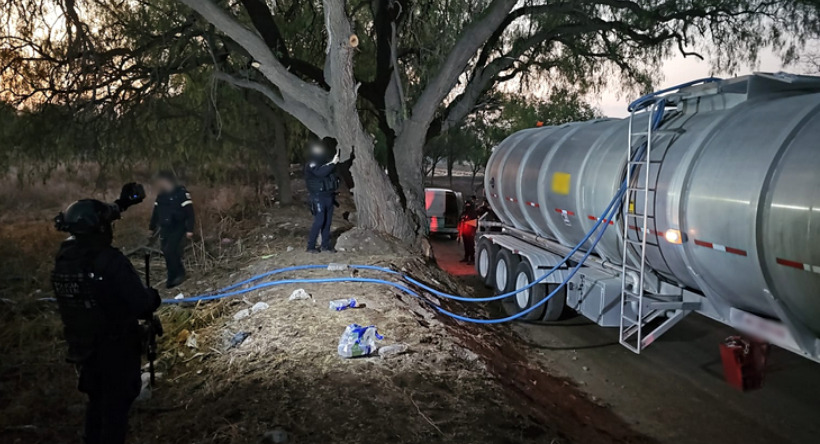 En apego a los protocolos de actuación y al finalizar una revisión, se les aseguraron cuatro armas calibre 9 milímetros y una más calibre .380 milímetros, varios cartuchos útiles, un tractocamión con cisterna con un contenedor de 55 mil litros de capacidad que era abastecido desde la toma clandestina, siete camionetas y cuatro chalecos tácticos.