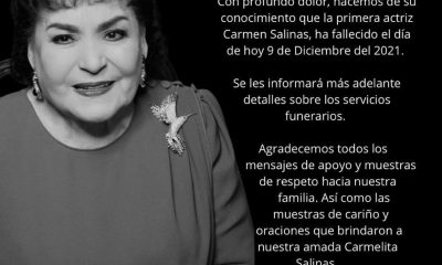 CDMX (10 DICIEMBRE 2021). – Mediante redes sociales, familiares de la actriz Carmen Salinas, informaron sobre el fallecimiento de la también productora quien perdió la vida...