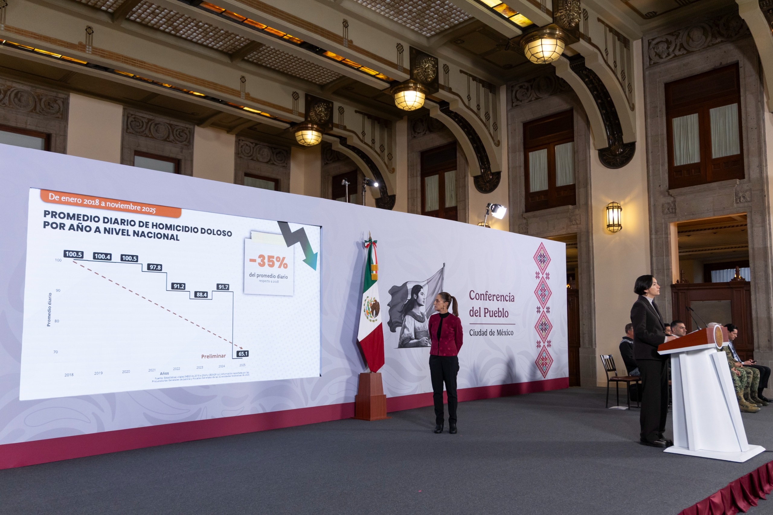 La titular del Secretariado Ejecutivo del Sistema Nacional de Seguridad Pública, Marcela Figueroa Franco, informó que en los últimos 14 meses se ha mantenido una tendencia a la baja en el homicidio doloso. Mientras que el promedio diario por año disminuyó en 35 por ciento respecto al 2018, pasando de 100.5 a 65.1, por lo que el 2025 se perfila como el año con menos homicidios.