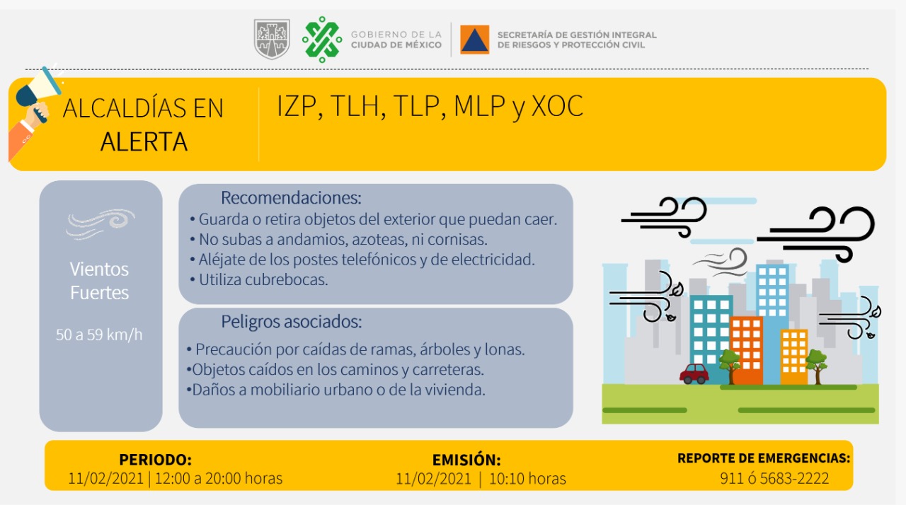 CIUDAD DE MÉXICO (11 DE FEBRERO 2021)-. La Secretaría de Gestión Integral de Riesgos y Protección Civil, informó que se activó la Alerta Amarilla por pronóstico de rachas de vientos fuertes en las alcaldías Iztapalapa, Tláhuac, Tlalpan, Milpa Alta y Xochimilco.