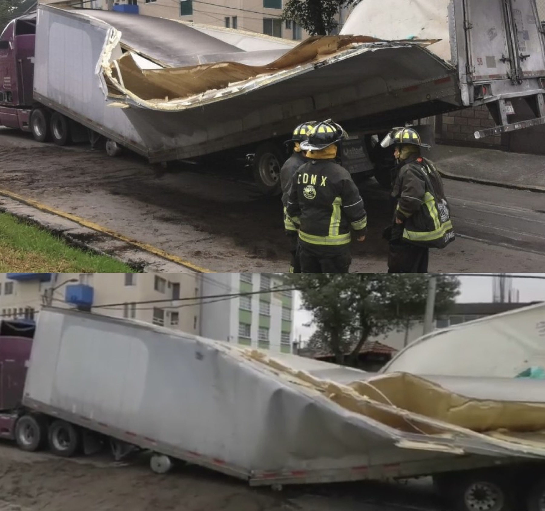 CDMX (05 OCTUBRE 2021). – Está mañana un trailer cargado con varias toneladas de carne, de quedó atorado en un bajo puente de la Avenida Río Churubusco.