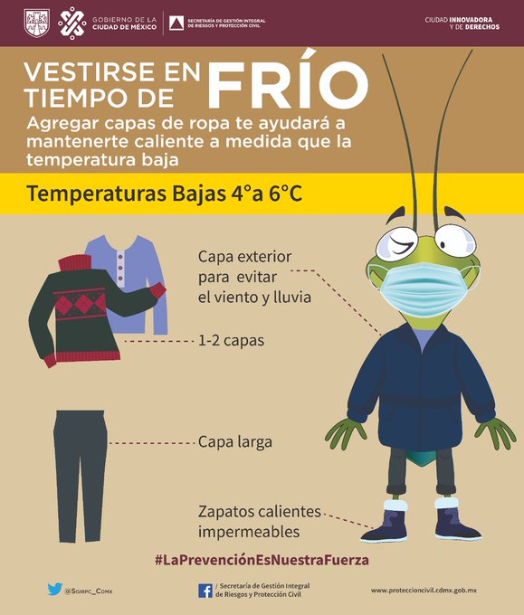 Las recomendaciones de esta dependencia son: cubrir nariz y boca, usar ropa abrigadora, evitar cambios bruscos de temperatura, usar crema rehidratante e ingerir alimentos ricos en vitaminas A y C, además, usar dos cambios de ropa y zapatos calientes e impermeables.