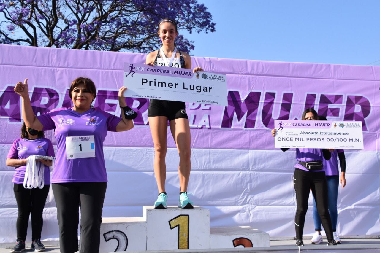 La alcaldesa entregó los reconocimientos económicos a las ganadoras de los primeros lugares en el nivel absoluto de la justa deportiva, en la que la competidora iztapalapense Roxana “N” obtuvo el primer lugar como ganadora absoluta en categoría libre, cuyo tiempo fue de 17:41 minutos, galardonada con un premio económico de 11 mil pesos.