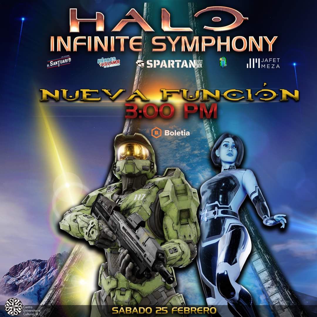CIUDAD DE MÉXICO 13 FEBRERO 2023). – Symphony Show Entertainment y Spartan Fest MX 2022 Halo México llegan al Centro Universitario Cultural A.C. ubicado en Odontología #35 Col. Copilco en la CDMX, este próximo 25 de febrero con un magno evento y la proyección en Full HD audio y video de los pasajes más emblemáticos del multipremiado y exclusivo videojuego de la franquicia HALO de Xbox (Halo: Combat Evolved, Halo 2, Halo 3, Halo 3 ODST, Halo 4, Halo 5: Guardians y Halo: Infinite) acompañada por una gran orquesta y coros completamente en vivo junto con un pabellón de recepción Cosplay de talla internacional.