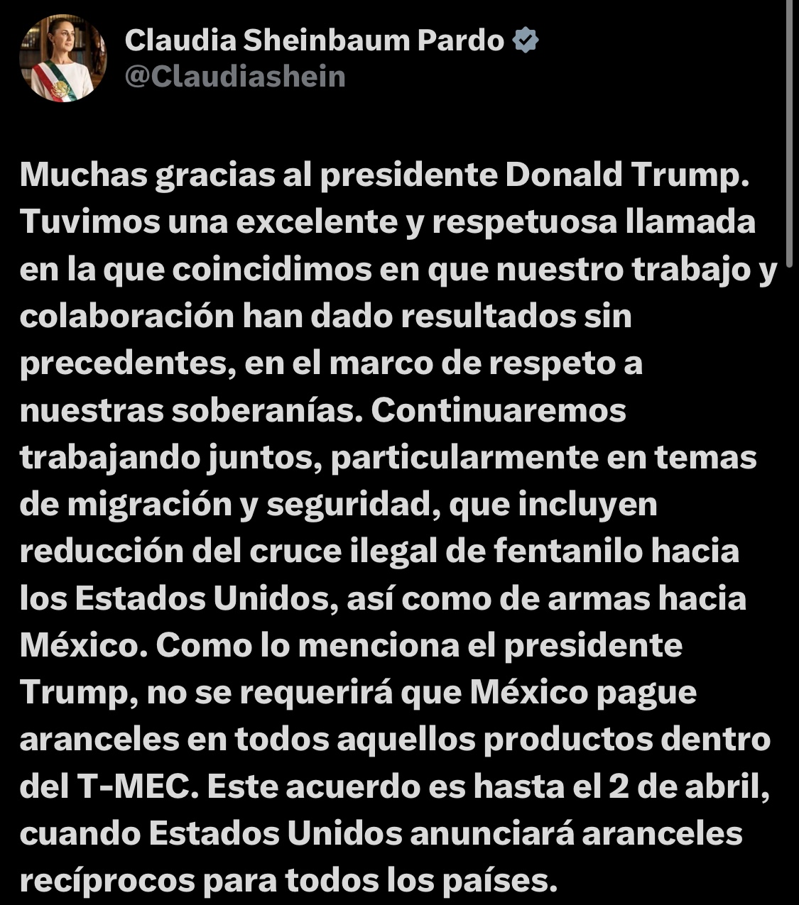 “Continuaremos trabajando juntos, particularmente en temas de migración y seguridad, que incluyen reducción del cruce ilegal de fentanilo hacia los Estados Unidos, así como de armas hacia México. Como lo menciona el presidente Trump, no se requerirá que México pague aranceles en todos aquellos productos dentro del T-MEC. Este acuerdo es hasta el 2 de abril, cuando Estados Unidos anunciará aranceles recíprocos para todos los países”