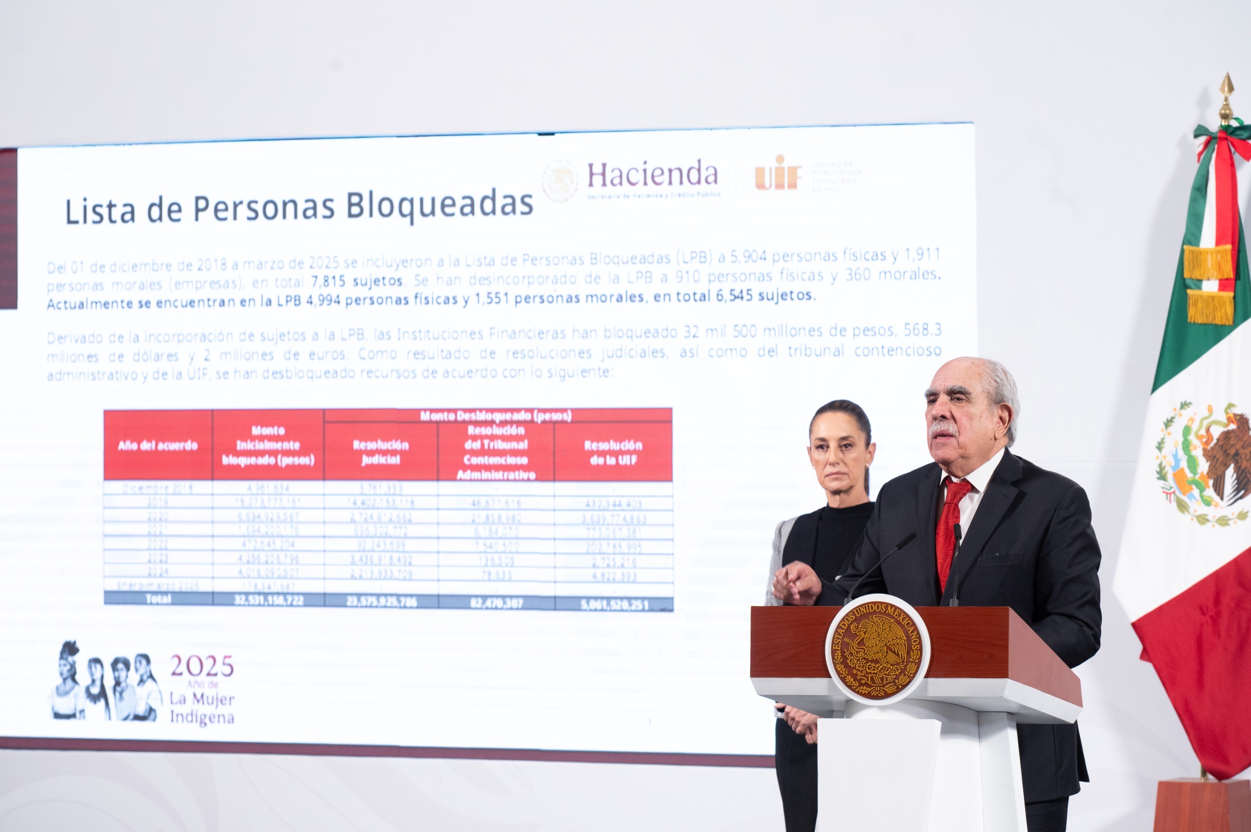 El titular de la UIF, Pablo Gómez, informó que del 1 de diciembre de 2018 a marzo de 2025 se incluyeron a la Lista de Personas Bloqueadas (LPB) a 5 mil 904 personas físicas y mil 911 personas morales, es decir empresas, en total 7 mil 815 sujetos. También se han desincorporado de la LPB a 910 personas físicas y 360 morales. Actualmente se encuentran en la LPB en total 6,545 sujetos: 4 mil 994 personas físicas y mil 551 personas morales.