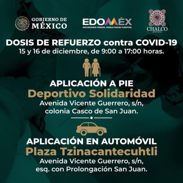 CHALCO (13 DICIEMBRE 2021). – Luego de que autoridades a nivel mundial anunciaran que la aplicación de una tercera dosis como refuerzo contra el COVID19 podía ser administrada a la población, la Secretaría de Salud informó el inicio de estas nuevas jornadas en nuestro país.