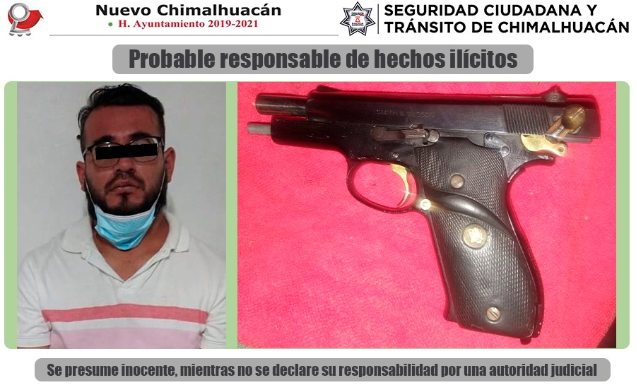 CHIMALHUACÁN (05 ABRIL 2021). – Durante un operativo de la Dirección de Seguridad Ciudadana y Tránsito de Chimalhuacán, se logró la captura de un hombre, presunto responsable de portación de arma de fuego en barrio fundidores de la localidad.