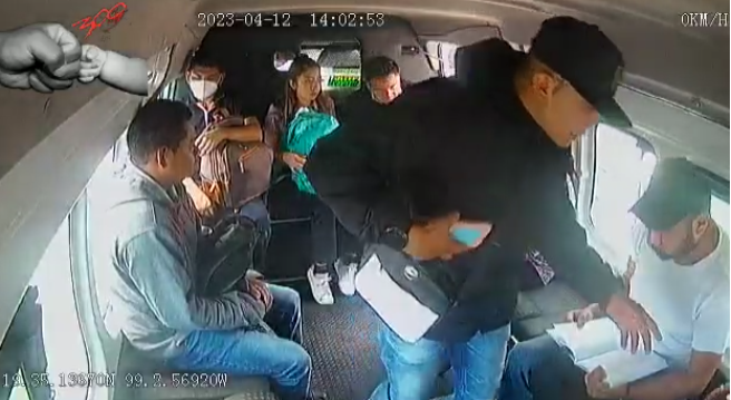 ECATEPEC (12 ABRIL 2023). – Cámaras de seguridad colocadas al interior de una unidad de transporte público captaron el momento en el que dos sujetos asaltaban a los pasajeros mientras circulaban sobre la autopista México-Pachuca.
