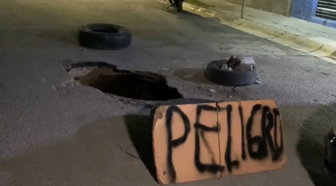 Con un letrero de «Peligro» los vecinos avisaban a los transeúntes y conductores de automóviles que estaban pasando por una zona de riesgo, pues además, una persona de la tercera edad ya había sido víctima del hoyo.