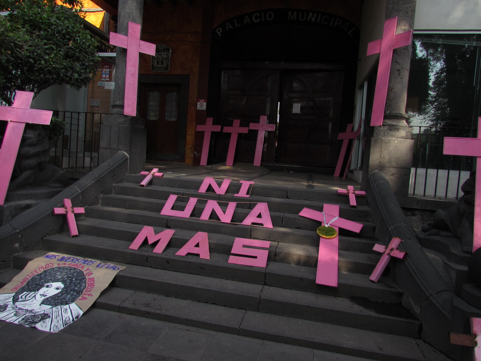 Tras el recorrido, frente a la casa donde vivía Mariana Lima Buendia, en Av. Juárez y Calle Colón, en el barrio Xochitenco, se colocó una cruz enorme, color rosa, que pretende recordar a las mujeres que han sido asesinadas en la zona.