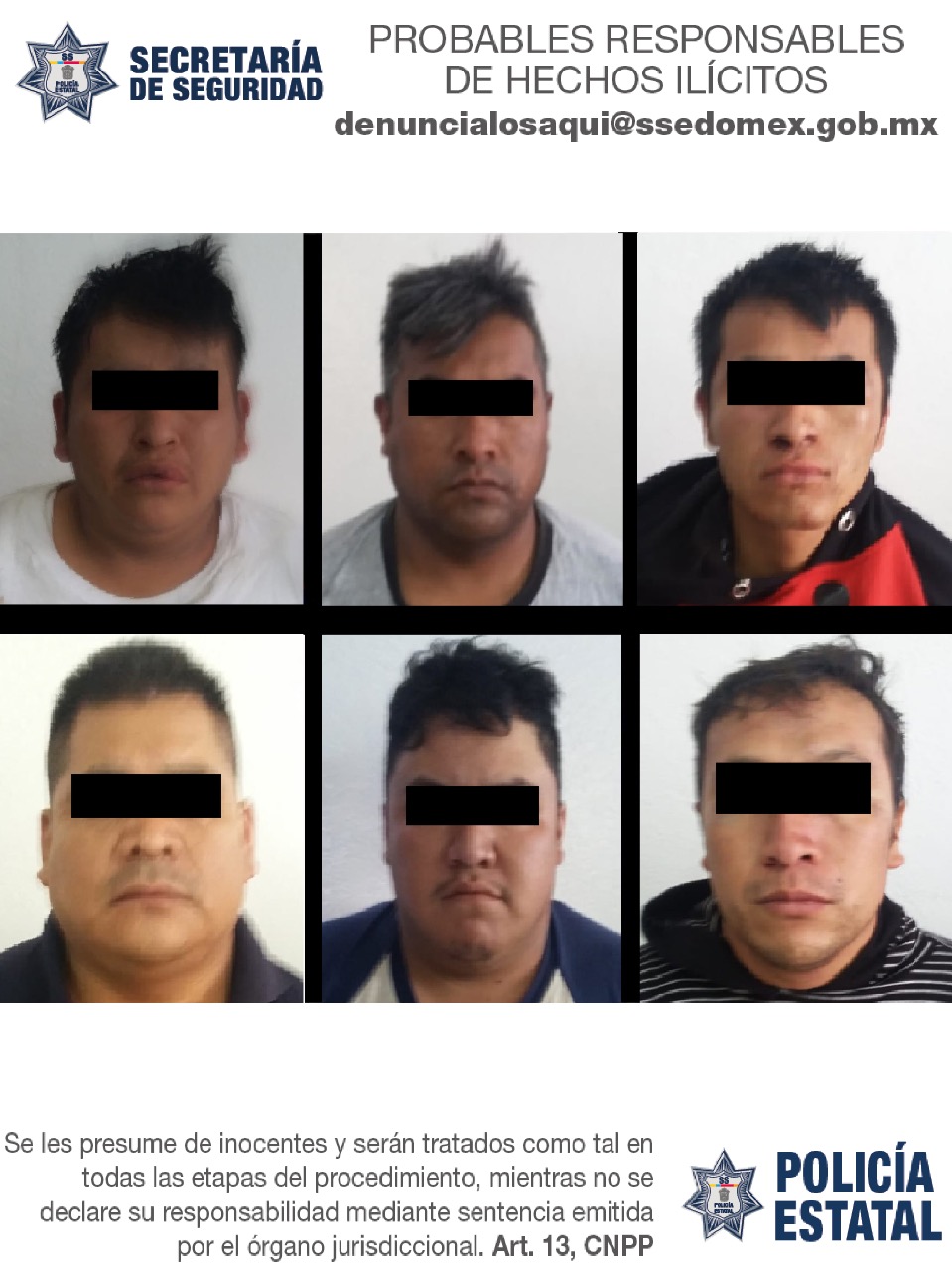 Al arribar al lugar, los uniformados capturaron a Julio “N”, Luis “N”, Alberto “N”, Jesús “N”, Osvaldo “N”, y José “N” de 27,38,39,33,23 y 28 años respectivamente, así como un menor de edad,  quienes viajaban en un vehículo Nissan, tipo Tsuru, de color gris, sin matrícula.