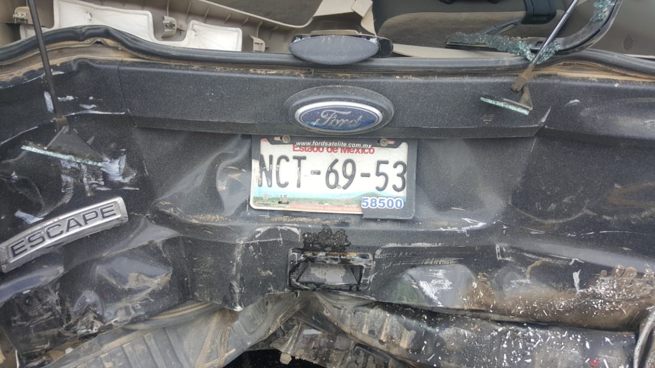 camioneta SCAPE color negro y placas de circulación NCT-69-53 siendo rebotada