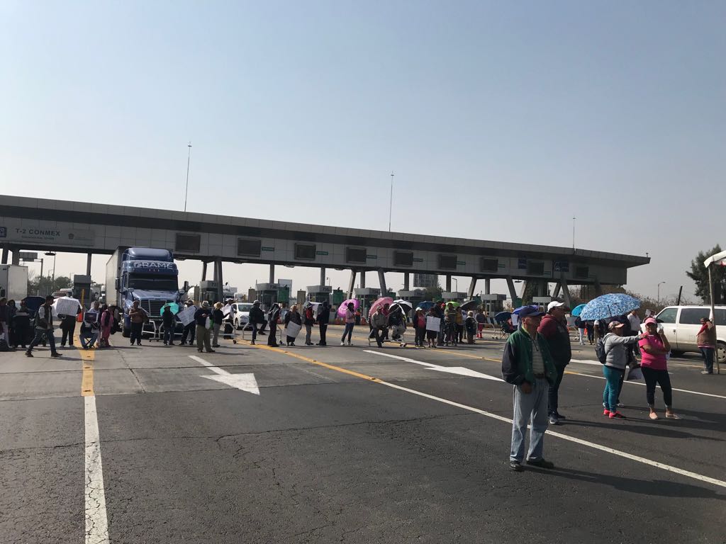 ECATEPEC (21 marzo 2018).- Vecinos de 17 colonias bloquean la caseta Las Américas del Circuito Exterior Mexiquense para exigir la reparación de sus viviendas dañadas presuntamente por la construcción y funcionamiento de esa vialidad