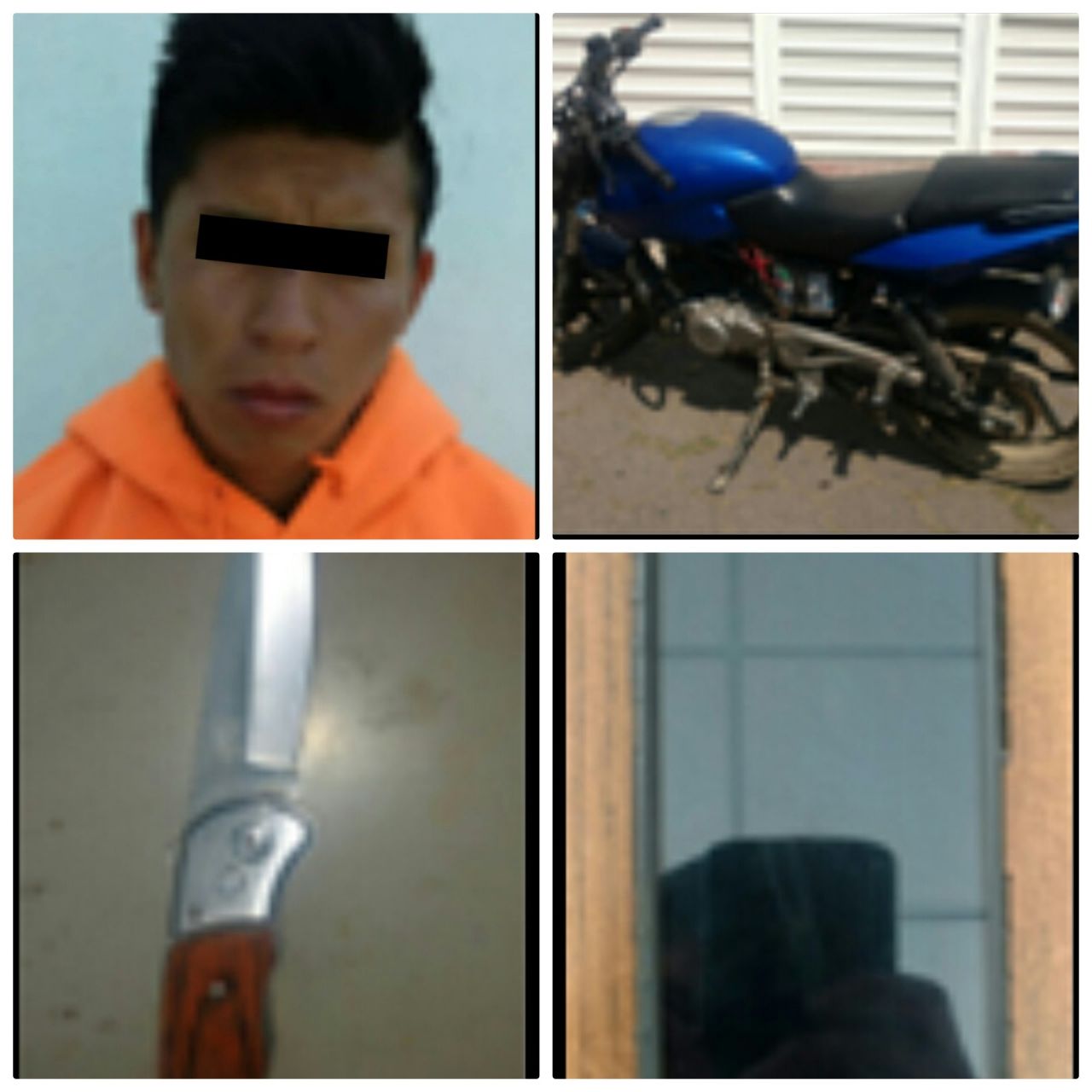 Después de una persecución, se logró capturar a Miguel “N”, de 20 años de edad, a quien se le encontró en posesión de una navaja de 25 centímetros y un teléfono celular; al verificar el estado legal de la motocicleta se descubrió que cuenta con reporte de robo con fecha del 19 de octubre de 2017.