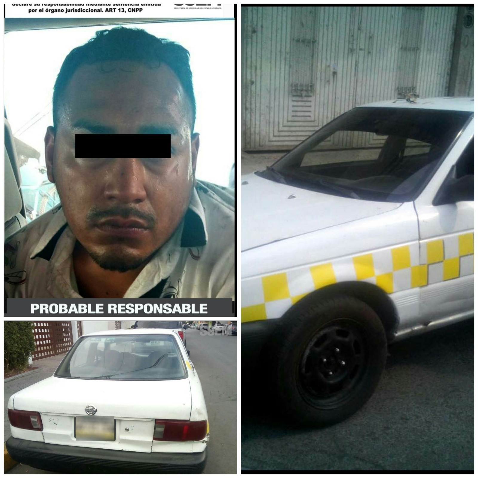 Los uniformados se percataron que el conductor del vehículo marca Nissan, tipo Tsuru, color blanco con cromática de taxi del Estado de México, tenía a la altura del pecho una bolsa tipo mariconera, y actuaba de manera sospechosa, por lo que le marcaron el alto.