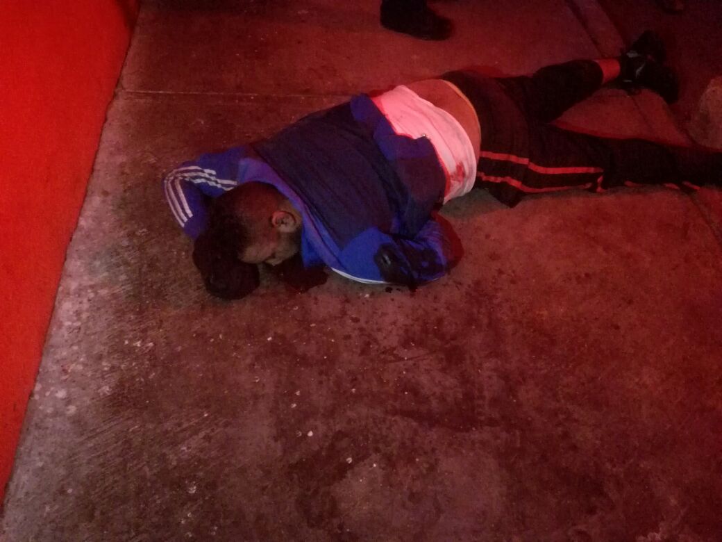 playera blanca y pantalón negro con rayas rojas y presentaba una herida en el