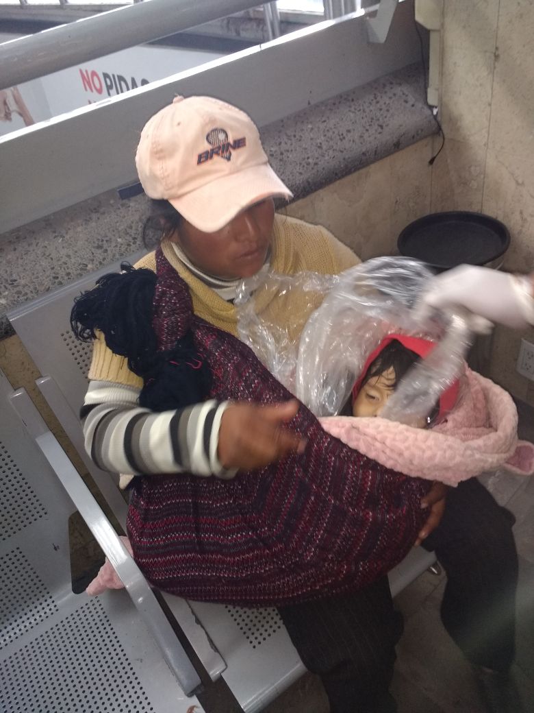 de plástico, envuelto en cobijas que sostenía con un rebozo.