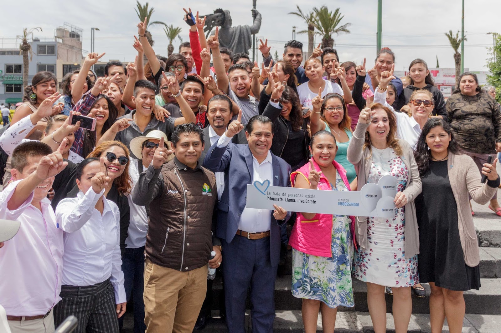 NEZAHUALCÓYOTL (17 agosto 2017).- Con el fin de mejorar las condiciones de seguridad para las mujeres y las niñas, el alcalde  de Nezahualcóyotl Juan Hugo de la Rosa García, acompañado de la activista y presidente de la Asociación Civil Unidos Contra la Trata Rosi Orozco, integró al municipio a  la campaña #AquíEstoy Contra la Trata de Personas, la cual es un esfuerzo internacional para combatir  y disminuir dicho delito en la que participan la Oficina de las Naciones Unidas Contra la Droga y el Delito, la Comisión Intersecretarial Contra la Trata de Personas  y ciudadanos organizados.