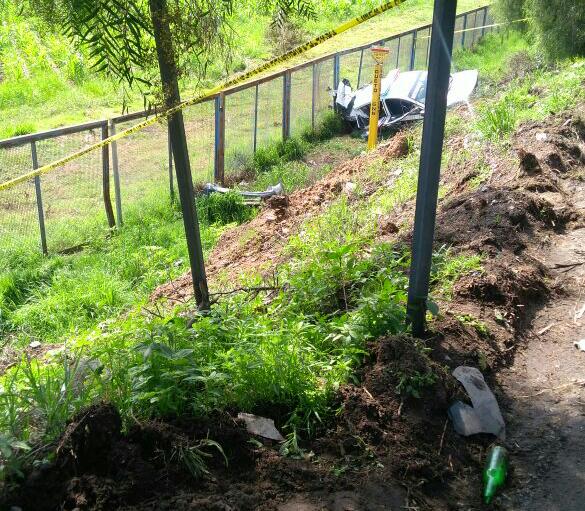 El auto Fiesta color gris con placas de circulación NCM 7776 del Estado de México quedó sobre la cinta asfáltica mientras que la patrulla TX 31 cayó a un terreno de cultivo.