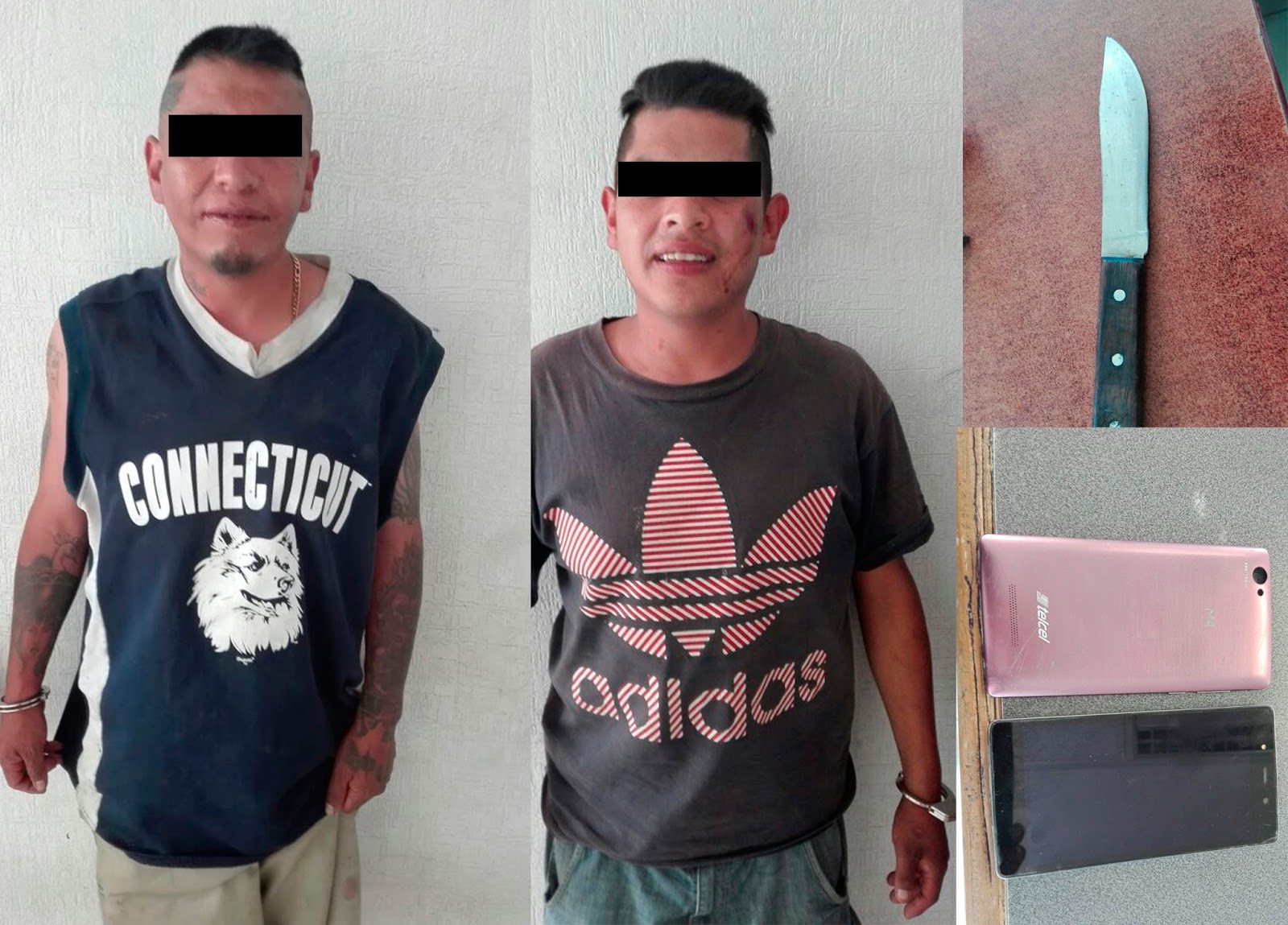 En el lugar fueron asegurados Francisco N y César N de 35 y 23 años de edad respectivamente, a los cuales se les realizó una revisión preventiva encontrando en uno de sus bolsillos el teléfono celular de la víctima, además de un cuchillo con el que se presume realizaron el robo.