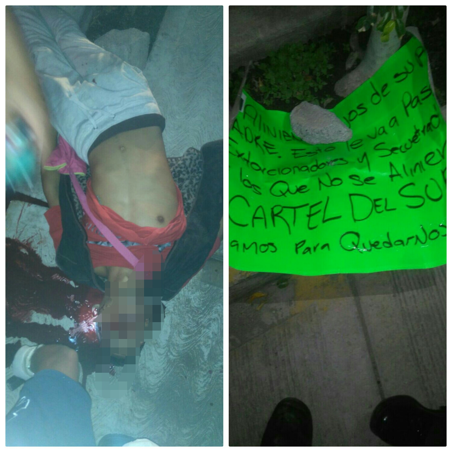 «Aliniense hijos de su puta madre esto le va a pasar extorsionadores y secuestradores y a los que no se alinien Atentamente Cartel del sur llegamos para quedarnos».