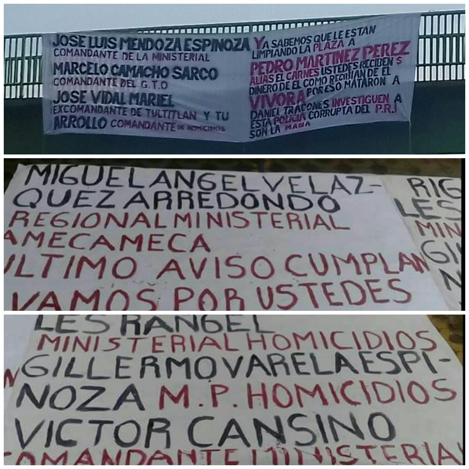 “Jose Luis Mendoza Espinoza, Comandante de la Ministerial, Marcelo Camacho Sarco, Cmte del G.T.O. Jose Vidal Mariel excomandante de Tultitlan y tu Arrollo, Comandante de Homicidios, ya sabemos que le estan limpiando la plaza a Pedro Martinez Perez, alias El Carnes, ustedes reciben $ dinero de el como recibian de El Vivora por eso mataron a Daniel Tracones, investiguen a esta policia corrupta del P.R.I. son la maña”, se leyó en aquella ocasión.