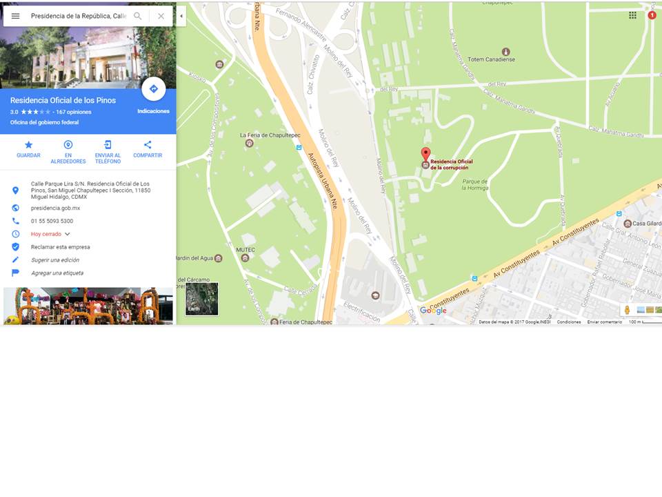 Ciudad de México (8 enero 2017).-La página de Google Maps sufrió un supuesto hackeo para sustituir la ubicación «Residencia Oficial de Los Pinos» por «Residencia Oficial de la Corrupción».