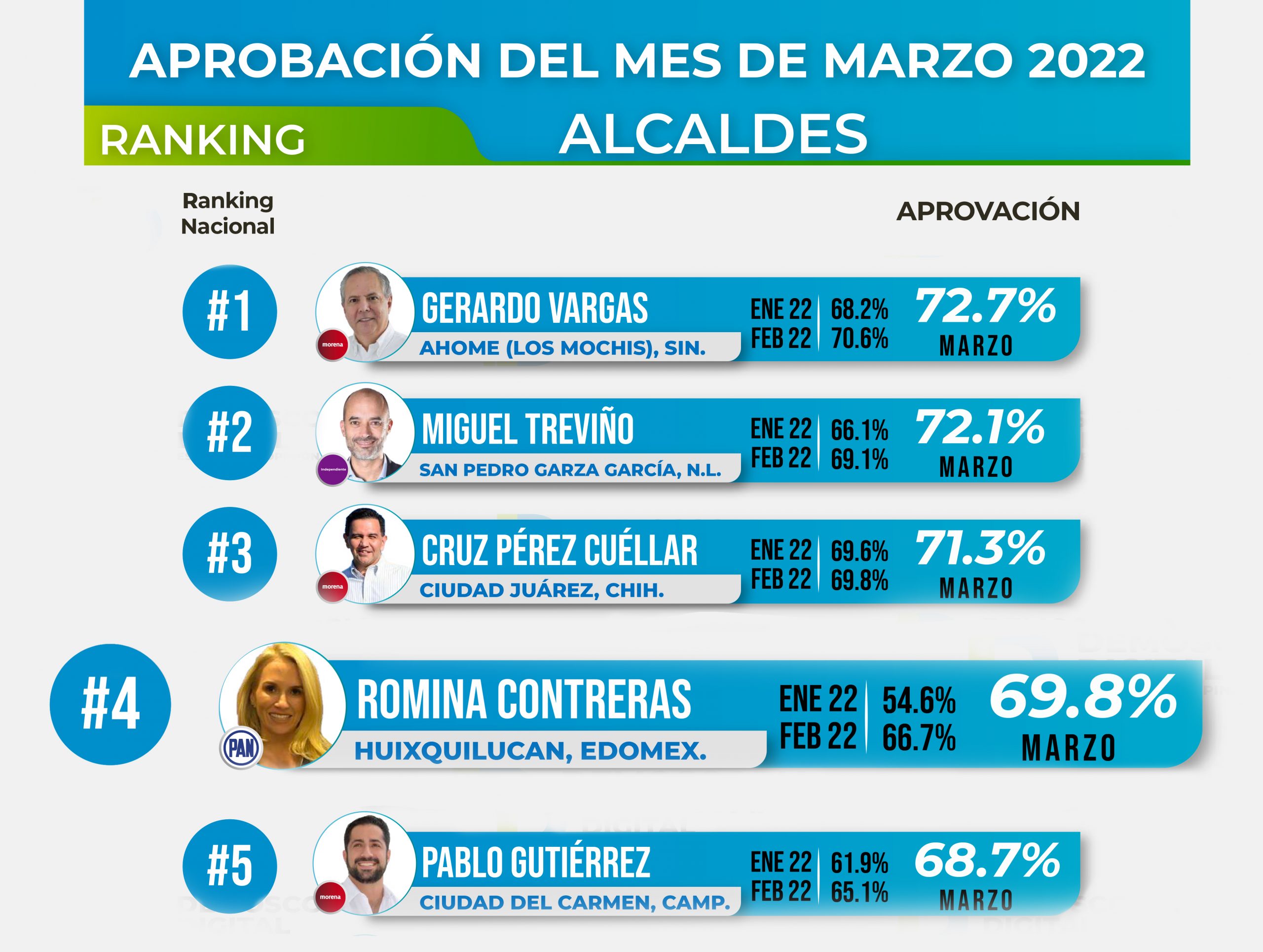 De acuerdo con el más reciente Ranking Nacional de Aprobación de Alcaldes de la empresa Demoscopia Digital y publicado este domingo 03 de abril, el gobierno municipal de Romina Contreras logró una aprobación de 69.8 por ciento, por parte de los ciudadanos de esta demarcación; la cuarta calificación más alta de las 188 ciudades más importantes que fueron evaluadas para dicha medición de opinión pública y es la mejor de los ediles del territorio mexiquense.