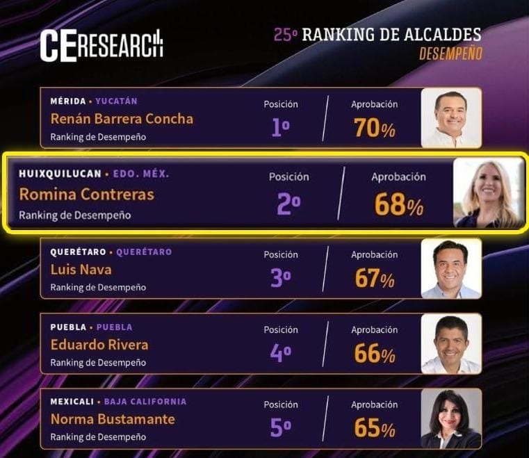 Los resultados del 25 Ranking de Alcaldes de México, dados a conocer este 20 de febrero, colocan a Romina Contreras en el primer lugar entre sus homólogos mexiquenses, con 68 por ciento de aprobación a su gestión al frente del Gobierno de Huixquilucan; cifras que también la posicionan en segundo lugar a nivel nacional.