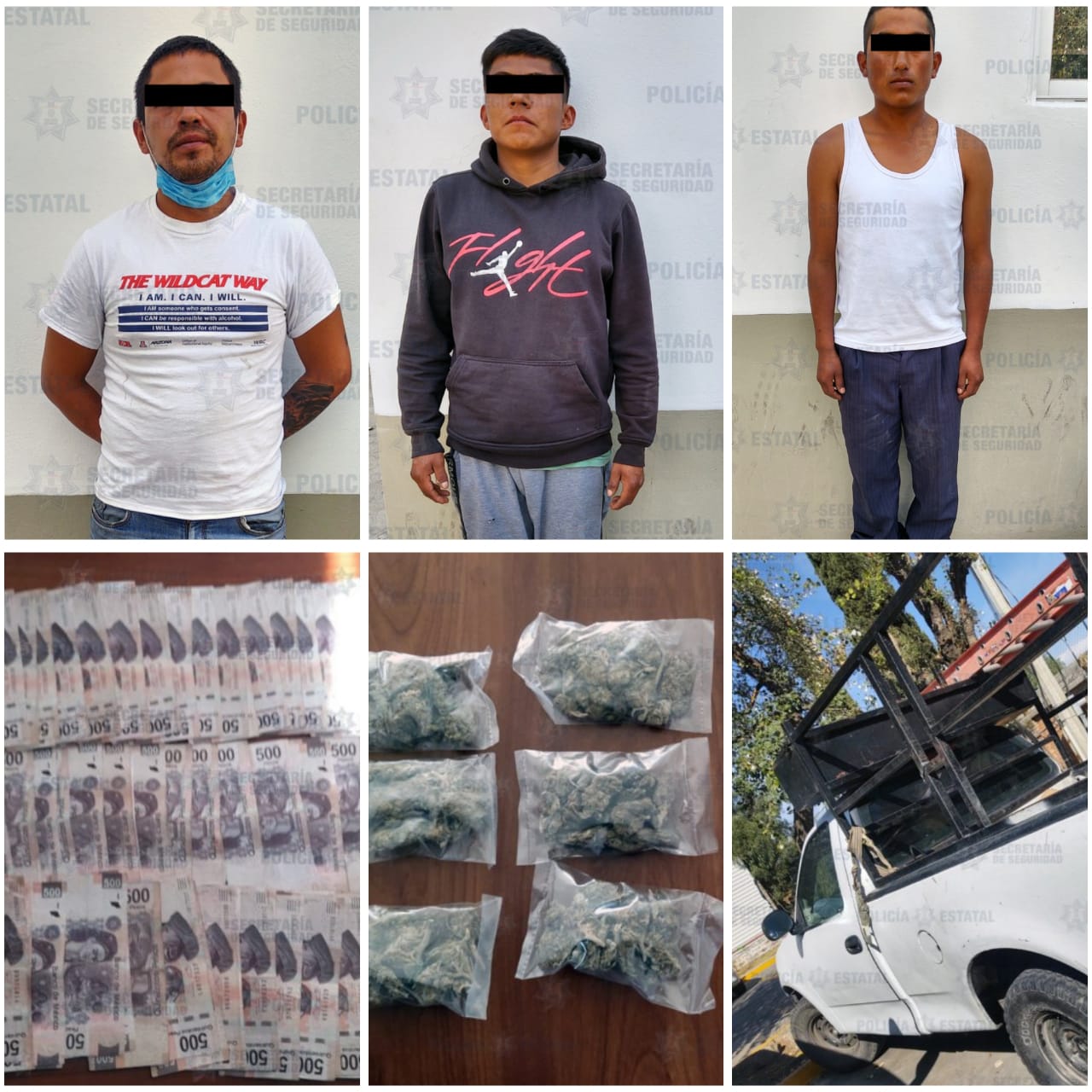 Durante la inspección los elementos de la SS encontraron entre las pertenencias de los sujetos nueve bolsas de plástico transparente con hierba verde y seca, características propias de la marihuana así como una mochila con 70 mil pesos en efectivo y de los cuales no pudieron acreditar su procedencia.