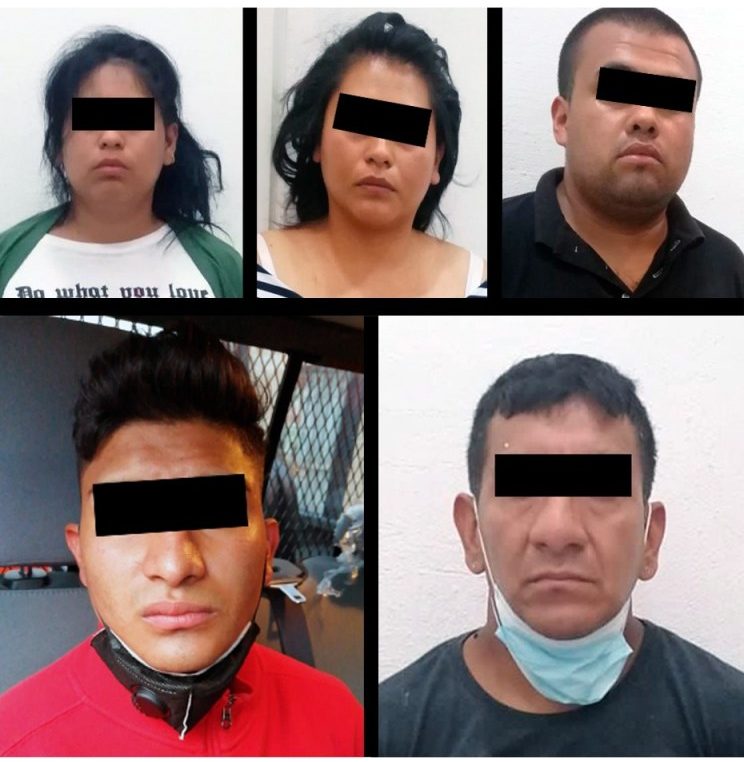 De forma simultánea, de la misma unidad salieron otros dos sujetos y una mujer quienes ingresaron al domicilio referido, dándoles alcance de inmediato, logrando la detención de siete personas identificadas como Martín «N» de 25 años; Fabiola «N» de 29 años; Mary «N» de 32 años, Brayan «N» de 22 años, Efrén «N» de 45 años de edad, así como dos menores de 11 y 14 años de edad.