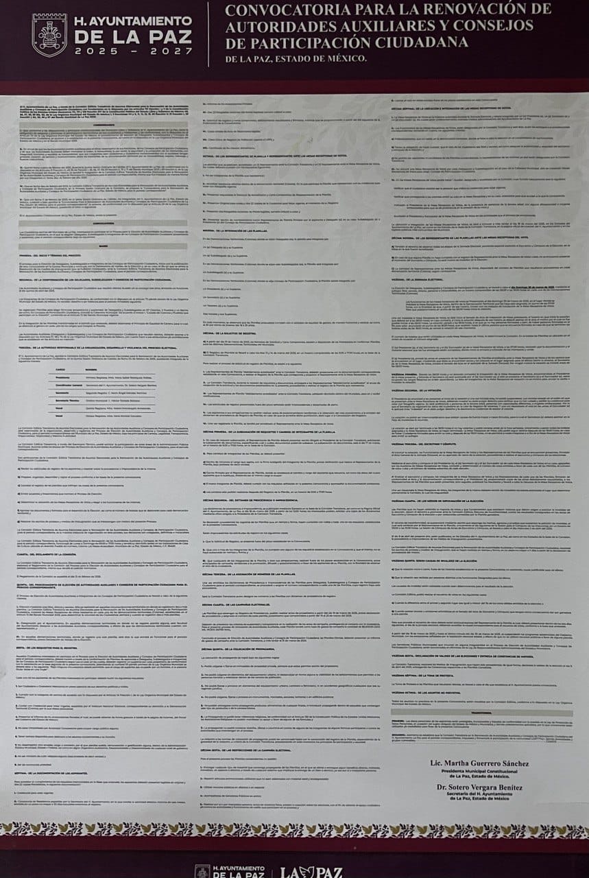 LA PAZ (18 FEBRERO 2025).- El H. Ayuntamiento de La Paz convoca a todo ciudadano interesado en participar el próximo 30 de marzo de 2025 en la renovación de Autoridades Auxiliares y Consejos de Participación Ciudadana, invitándolos a inscribirse junto con su planilla para ser elegidos y así representar y ayudar a su comunidad.