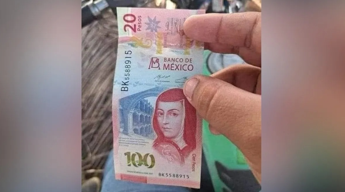 Este parecería un billete común y corriente de 100 pesos, pero en la parte superior se puede leer la cifra de 20 pesos.
