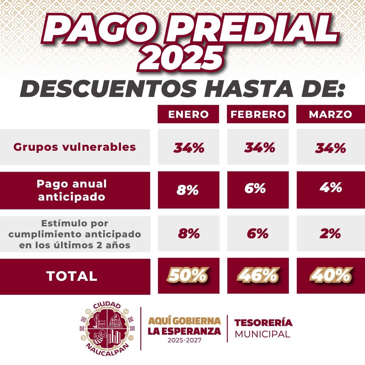 Para los usuarios cumplidos que pagan anualmente por cuota fija y que realizan pagos bimestrales por el servicio de agua potable, el Organismo de Agua Potable, Alcantarillado y Saneamiento de Naucalpan (OAPAS) otorgará un estímulo fiscal consistente en una bonificación del 8%, 6% y 4% sobre el importe total durante los meses de enero, febrero y marzo del ejercicio fiscal 2025. Adicionalmente, a los contribuyentes que hayan cumplido con los plazos establecidos en los dos últimos años se les otorgará un 4% en enero y un 2% en febrero.