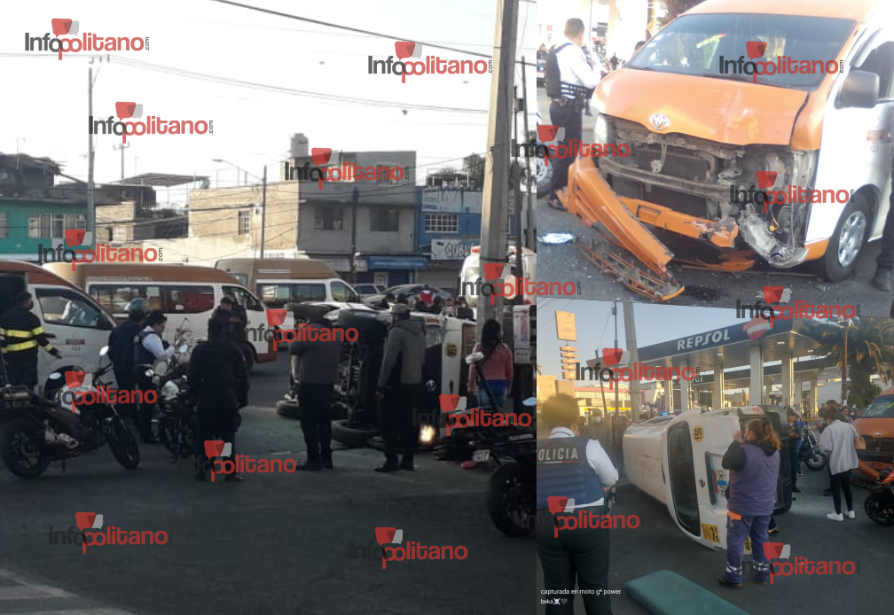 NEZAHUALCÓYOTL (08 MARZO 2022). – Nueve pasajeros lesionados fue el resultado del choque entre dos camionetas de pasajeros, una de las cuales volcó en la Colonia Vicente Villada de este municipio del oriente del Estado de México.