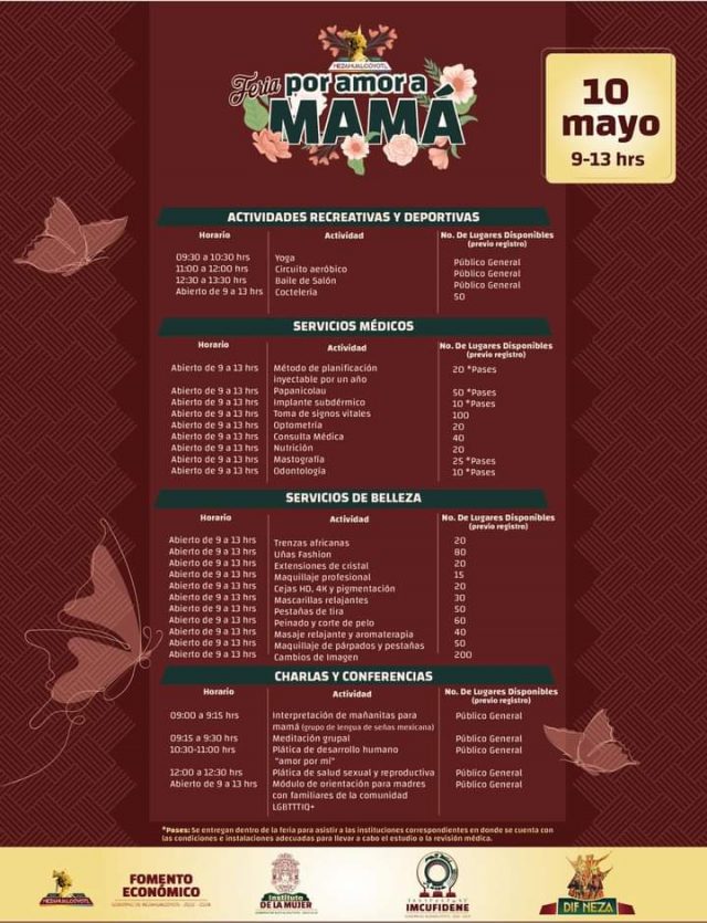 Adicionalmente, señaló el alcalde, el 10 de mayo en la Explanada Municipal de las 9 de la mañana a la 1 de la tarde se instalará la Feria «Por Amor a Mamá», en donde por medio de diversas actividades y servicios de tipo recreativo, deportivo, médico y de belleza, las mamás también serán homenajeadas en su día.