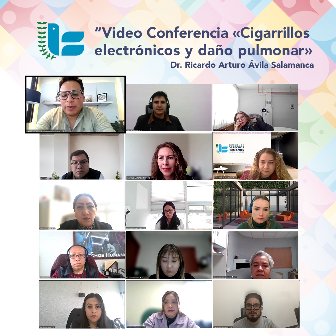 TOLUCA (27 MAYO 2025).- En el marco del Día Mundial Sin Tabaco, bajo el lema 2025 «Desenmascaremos su atractivo: las tácticas de la industria con los productos de tabaco y nicotina al descubierto», y como parte de las acciones de corresponsabilidad en la vida laboral, personal y familiar emprendidas en la Comisión de Derechos Humanos del Estado de México (CODHEM), el médico adictólogo doctor Ricardo Arturo Ávila Salamanca impartió la videoconferencia titulada «Cigarrillos electrónicos y daño pulmonar».