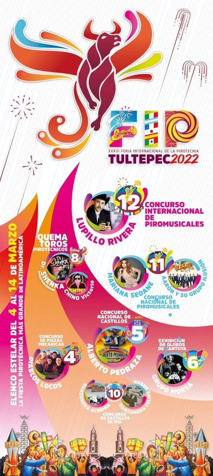 El viernes 11 de Marzo llega el Concurso Nacional de Piromusicales y la presentación estelar de Mariana Seoane con Aarón y su grupo Ilusión. Y por último y como broche de oro, el Sábado 12 de Marzo se tendrá el Concurso Internacional de Piromusicales y la presencia estelar para el cierre artístico de la Feria a Lupillo Rivera con un show muy especial.